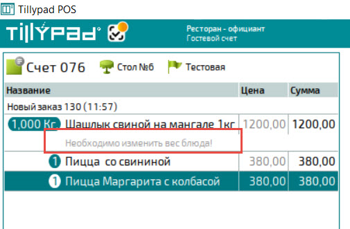 4) При передаче счета в оплату проверяется наличие комментария "Необходимо изменить вес блюда", если он будет найден у любой строки, то будет выведена ошибка на ПОСе. Таким образом, нельзя будет закрыть счет, не изменив объем у весового блюда на фактический.